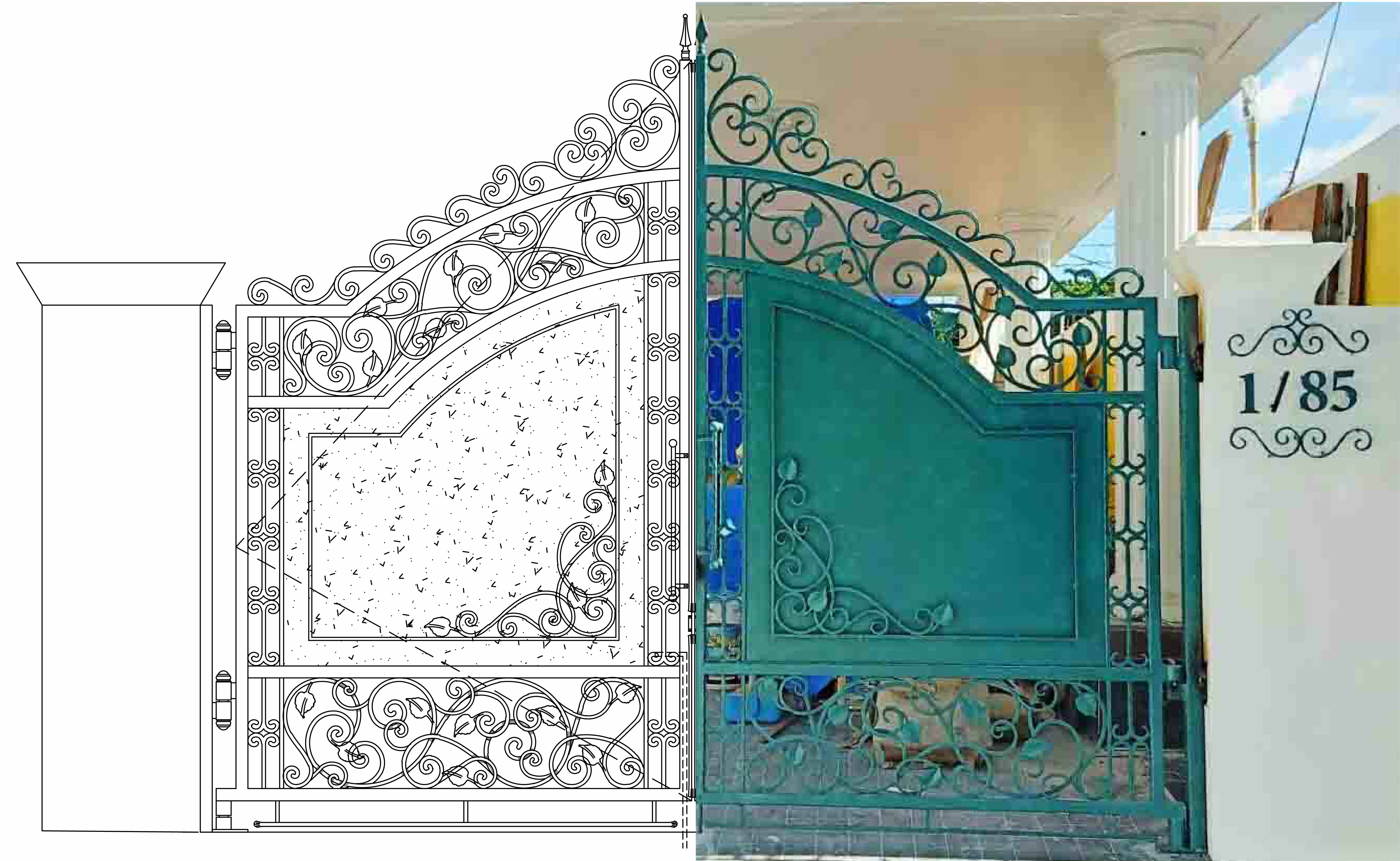 ประตูเหล็กดัดอิตาลี รูปแบบด้านบนโค้ง ด้านล่างปิดทึบ บวกกับลวดลายเหล็กดัดที่ไม่เยอะ จึงเกิดเป็นผลงานชิ้นนี้